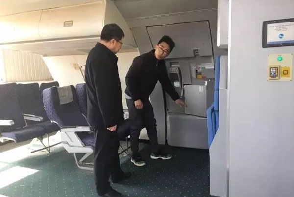 工程师齐新松详细讲解航空模拟舱设备的训练方式和方法,并操作演示,冷志强院长认真聆听并反复咨询操作时的注意事项。